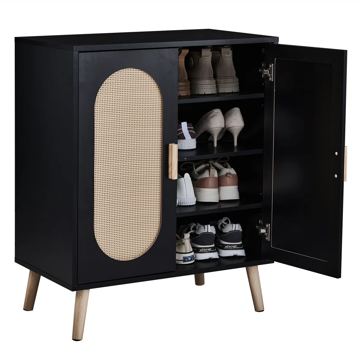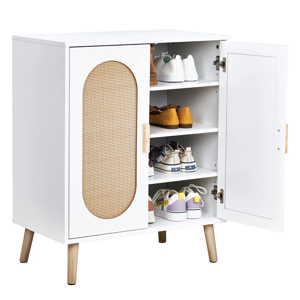 - التصميم: عصري (Modern Boho) يجمع بين العملية والشكل الجمالي، مع ضلف خوص (Rattan) تسمح بتهوية الأحذية وتمنع الروائح.