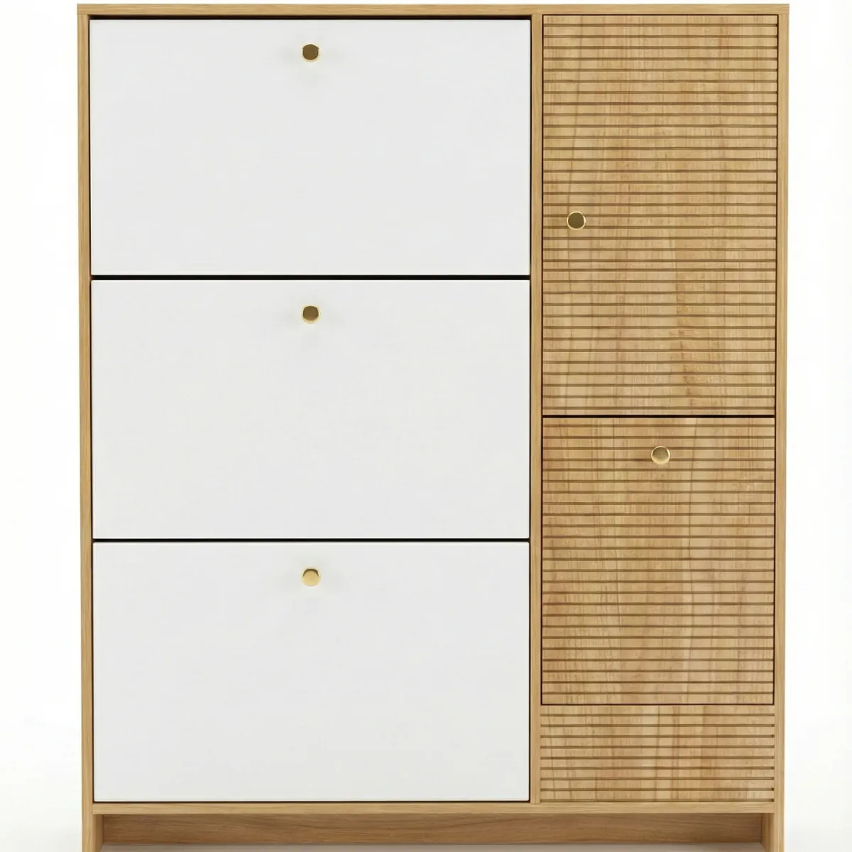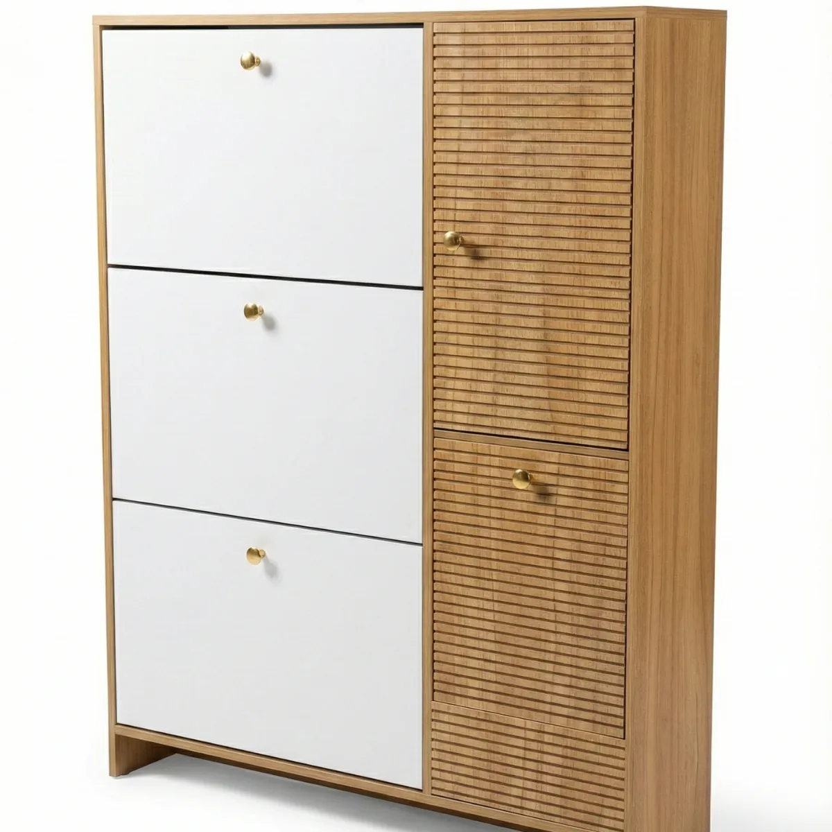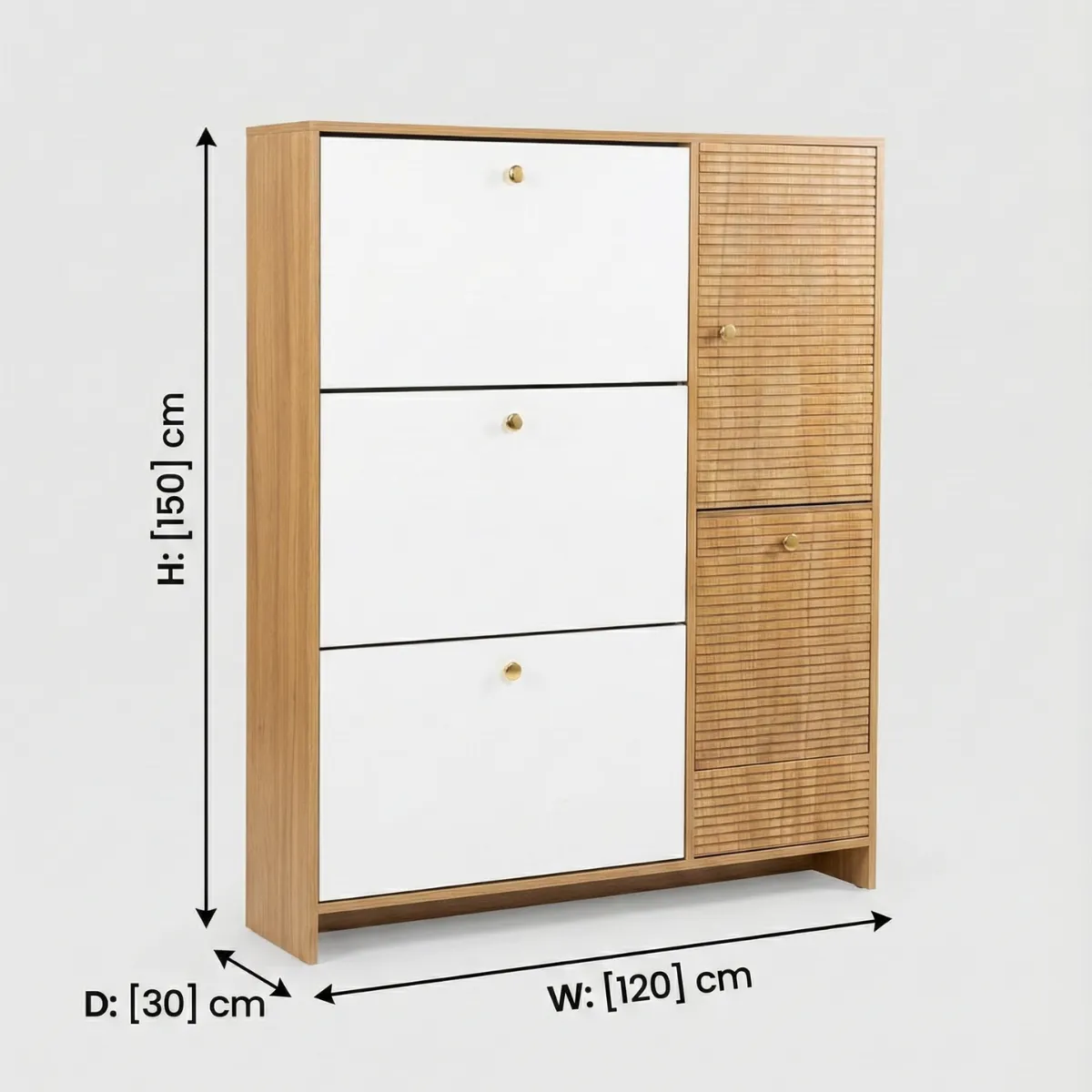 الجزء الأيسر مكوّن من 3 أدراج سحب أمامية لتخزين الأحذية بطريقة منظمة، والجزء الأيمن درفة جانبية بتصميم شرائح مع رف داخلي لمساحة تخزين إضافية.