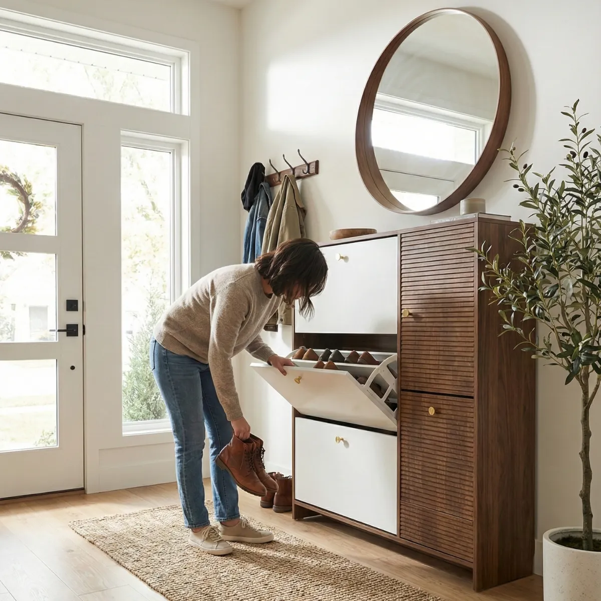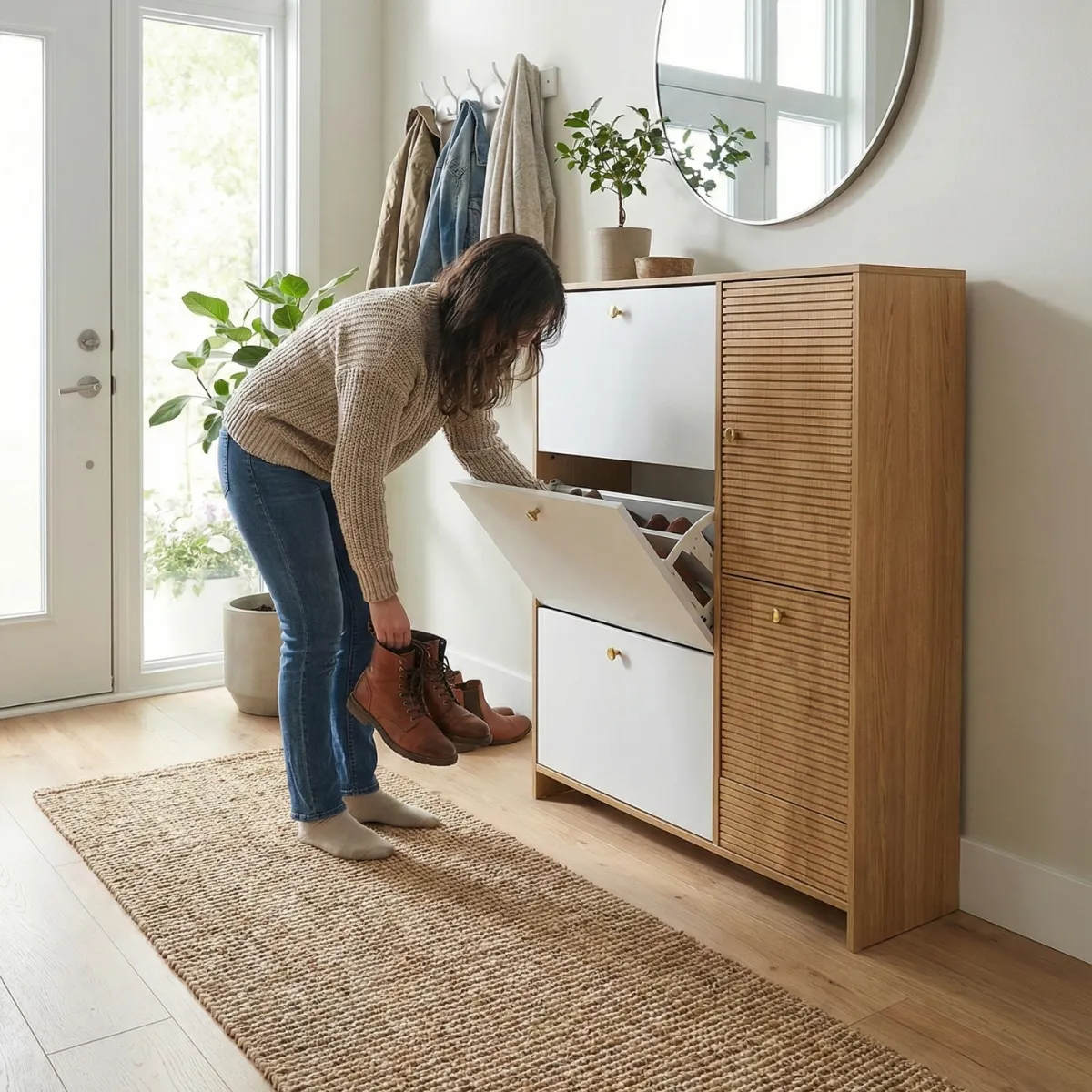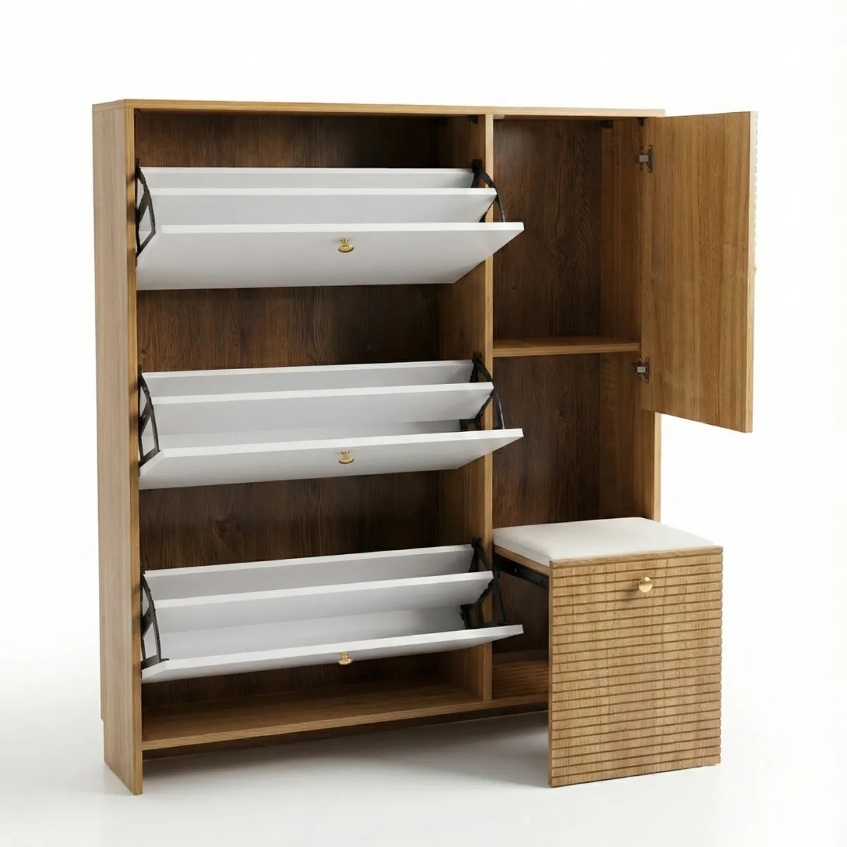 الجزء الأيسر مكوّن من 3 أدراج سحب أمامية لتخزين الأحذية بطريقة منظمة، والجزء الأيمن درفة جانبية بتصميم شرائح مع رف داخلي لمساحة تخزين إضافية.