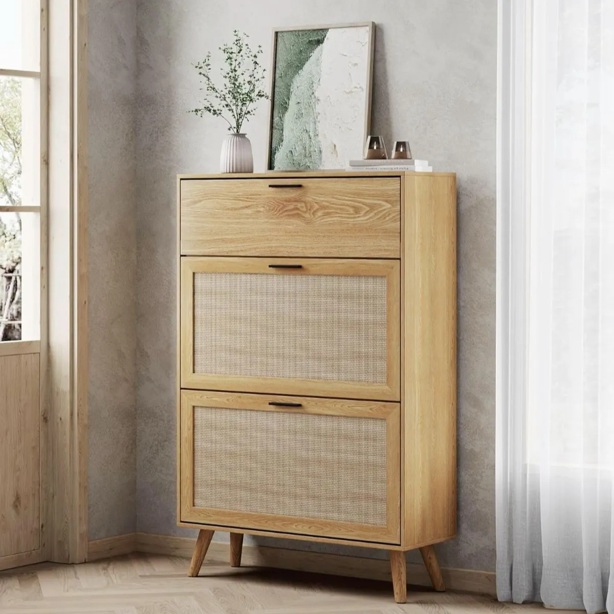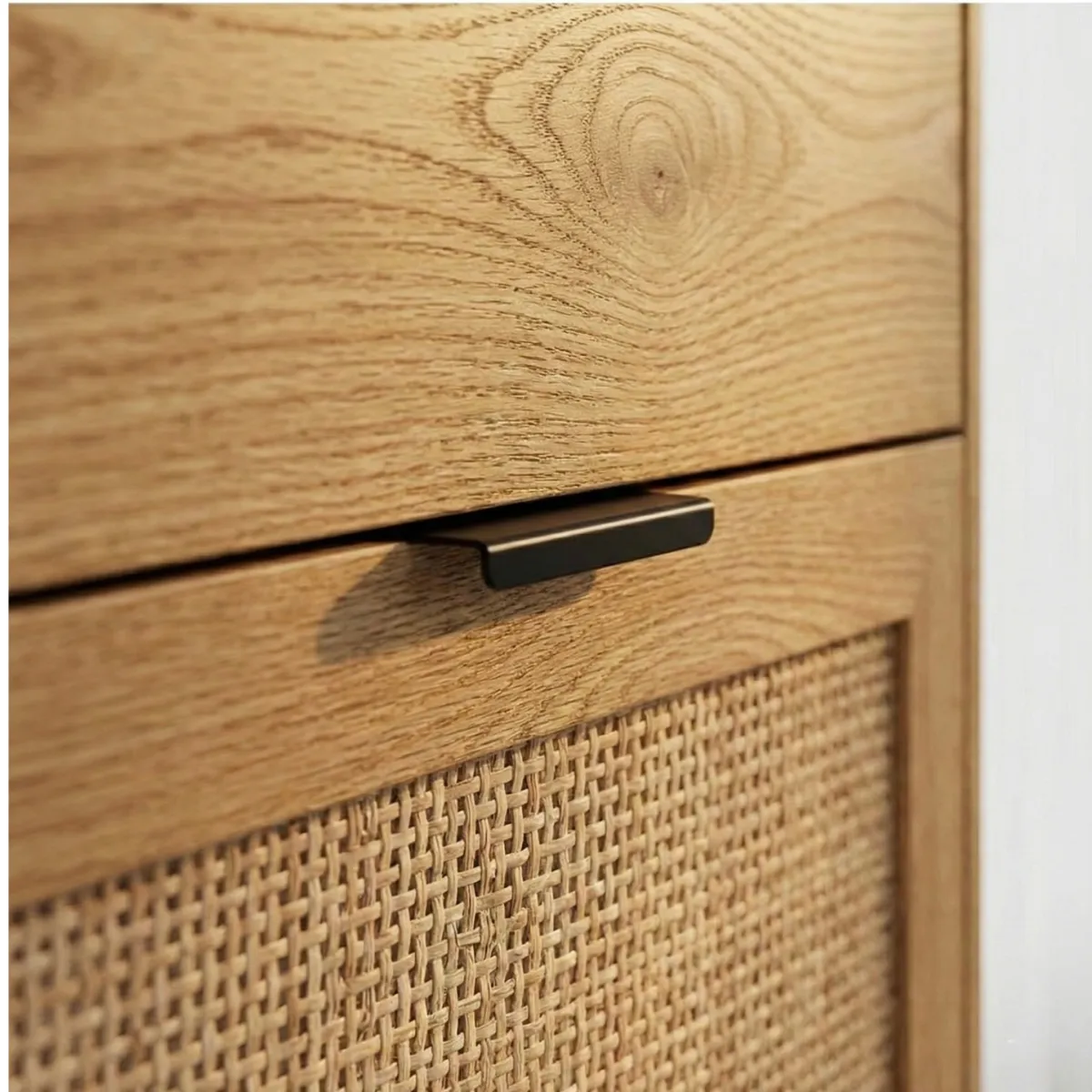 “الأناقة الطبيعية في أضيق المساحات. الوحدة دي بتجمع بين دفء الخشب الفاتح وشياكة الخوص الطبيعي (Rattan). تصميمها الرأسي الرفيع بيخليها مثالية لمداخل البيوت والممرات الضيقة، من غير ما تخنق المكان.