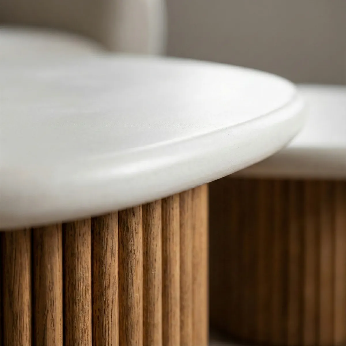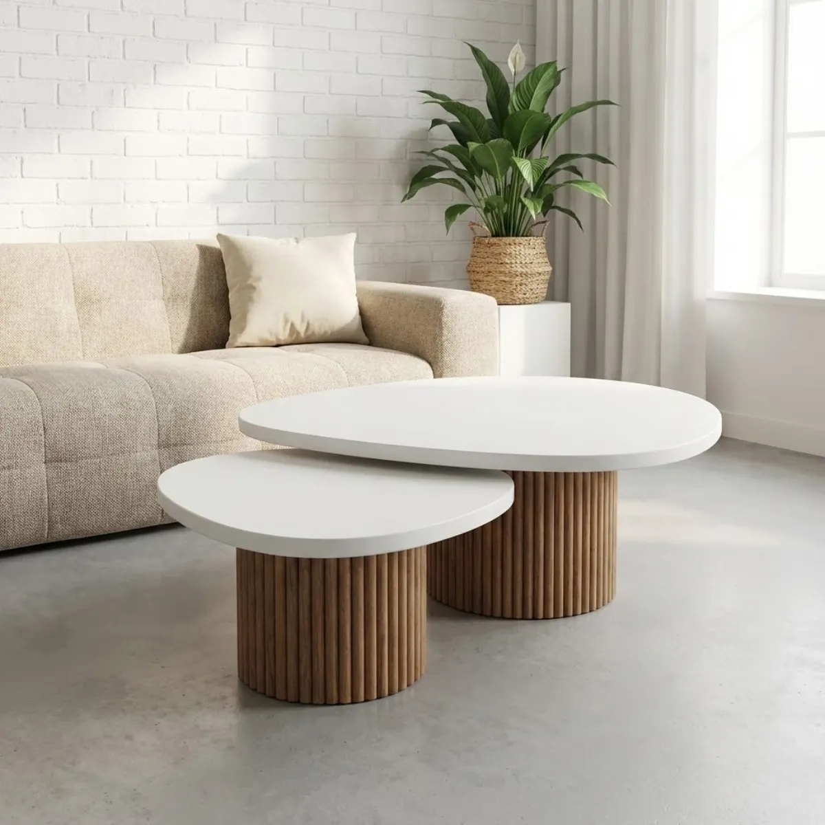 لو بتحبي الستايل الهادي والمريح للأعصاب (Japandi Style)، الطقم ده ليكي. تصميم “أورجانيك” على شكل سحابة بيكسر جمود الأشكال الهندسية التقليدية، وبيجمع بين نقاء اللون الأبيض في السطح ودفء الخشب الطبيعي في القاعدة، عشان يعمل توازن مريح للعين في غرفة المعيشة.