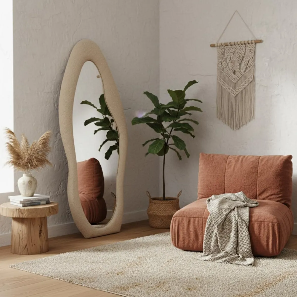 ملمس الفخامة: الإطار مكسو بقماش الباندا (Bouclé) صاحب الملمس البارز والناعم، وهو أحدث صيحات الديكور العالمية لإضافة إحساس بالدفء (Cozy Vibes).