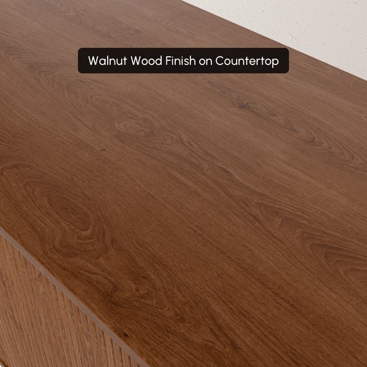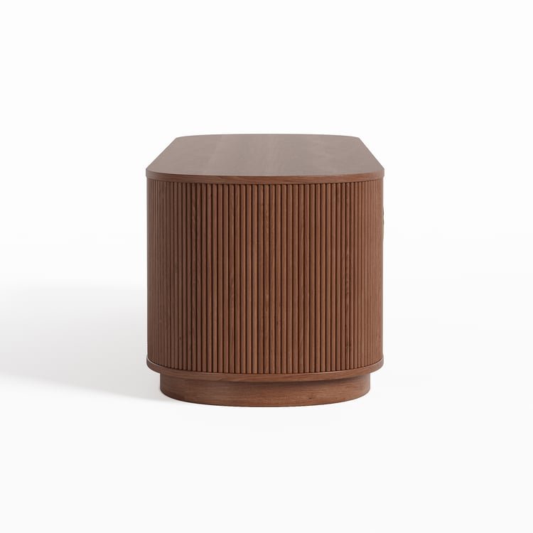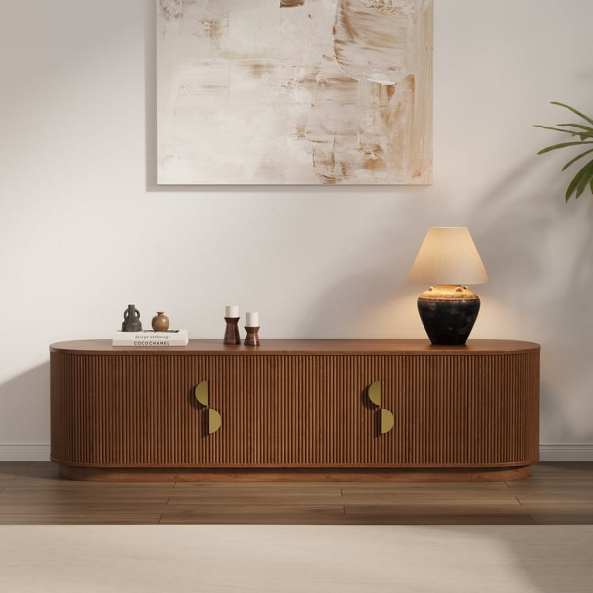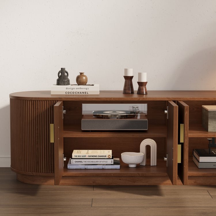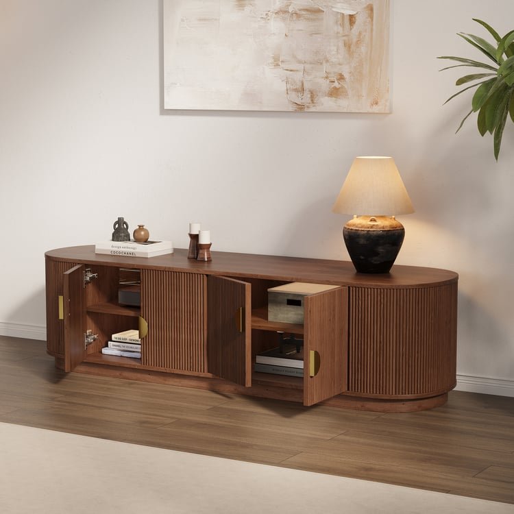 اكسري جمود الزوايا الحادة في غرفة المعيشة مع وحدة تلفزيون "فينوس". قطعة استثنائية بتصميم "الكبسولة" البيضاوي وتفاصيل الحفر الرأسي (Fluted) الدقيقة التي تغطي الوحدة بالكامل. اللمسة النهائية بالمقابض الذهبية نصف الدائرية تجعلها أيقونة للفخامة العصرية وليست مجرد طاولة للتلفزيون.
